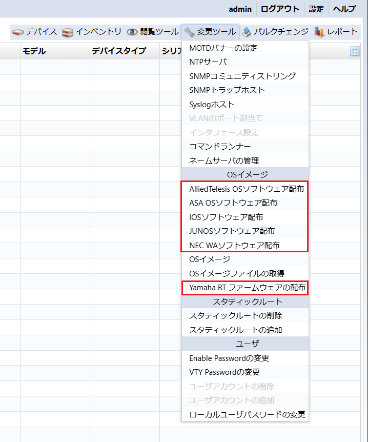 ただし、OS配布機能は、Allied Telesis、(Cisco)ASA、Cisco IOS、JUNOS、NEC WAおよびYamaha RTのみ対応しております。